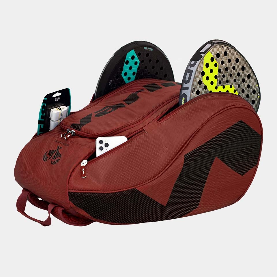 It has a large main pocket where you can take your clothes, towel, bottle of balls, accessories and all you need, also has two side pockets to save one padel racket on each one.